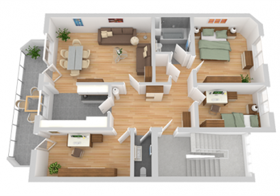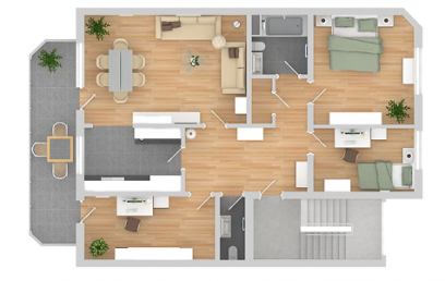Realistische Darstellung des Grundrisses für einen besseren Überblick über die gesamte Raumaufteilung sowie den räumlichen Proportionen. 3D Graphiken machen es einfacher für die Kunden sich den Wohnraum ihres Hauses sowie die Möblierung tatsächlich vorzustellen.